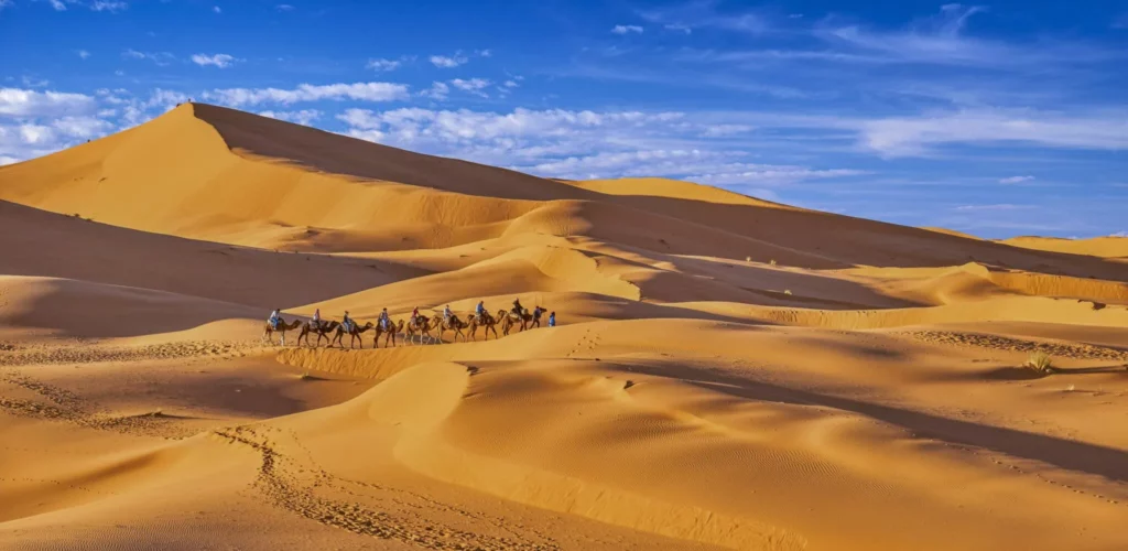 The Sahara Desert is undoubtedly one of the most remarkable places to visit in Morocco. As you leave the bustling cities behind, the landscape transforms into endless golden dunes that stretch as far as the eye can see. The silence is profound, broken only by the whisper of the wind or the soft shuffle of camel hooves, and as the sun sets, the sky ignites in shades of orange and pink. At night, a blanket of stars stretches overhead, creating a sense of wonder that feels almost otherworldly. Along the way, warm Berber hospitality adds a human touch to this vast, serene landscape. Whether you’re here for reflection, photography, or adventure, the Sahara offers moments that stay with you long after you leave. From quick escapes near Marrakech’s Agafay Desert to the iconic Erg Chebbi dunes of Merzouga, it’s a must-see destination on any traveler’s list of top places to visit in Morocco.